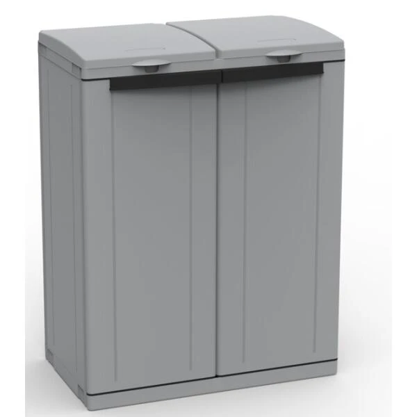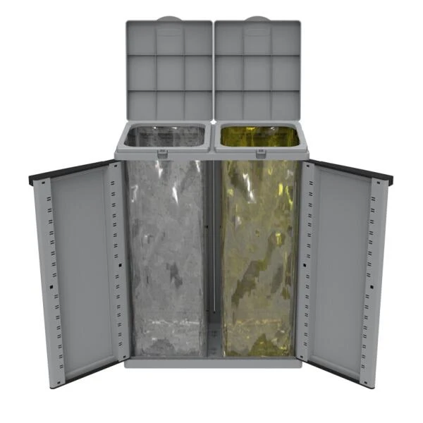 Met deze opbergkast is het afval op jouw terras, balkon of in jouw garage perfect weggeborgen en geen storend element meer. In de kast kan je perfect 2 vuilniszakken afzonderlijk ophangen en zo het afval efficiënt sorteren.