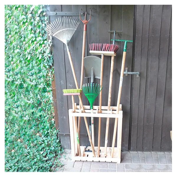Het grenenhouten rek is zodanig opgebouwd zodat je het tuingereedschap handig rechtop in de voorziene rasters kan zetten.